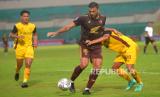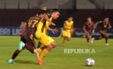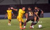 Bek PSM Makassar, Agung Mannan menahan penyerang Persikabo 1973 Gustavo pada pertandingan lanjutan BRI Liga 1 di Stadion Sultan Agung, Bantul, Yogyakarta, Senin (5/12/2022). Pada pertandingan ini PSM Makassar berhasil menang atas Persikabo 1973 dengan skor 2-0. Gol dicetak oleh Donald Bissa dan Everton. (FOTO : Republika/Wihdan Hidayat)