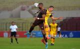 Bek PSM Makassar,l Yuran Fernandes (kiri) berhasil menang duel udara atas penyerang Persikabo 1973 Bruno Dybal pada pertandingan lanjutan BRI Liga 1 di Stadion Sultan Agung, Bantul, Yogyakarta, Senin (5/12/2022). Pada pertandingan ini PSM Makassar berhasil menang atas Persikabo 1973 dengan skor 2-0. Gol dicetak oleh Donald Bissa dan Everton. (FOTO : Republika/Wihdan Hidayat)