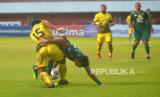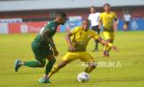 Bek Barito Putera, FR Sokoy menahan pergerakan penyerang Persebaya Juninho pada pertandingan lanjutan BRI Liga 1 di Stadion Maguwoharjo, Sleman, Yogyakarta, Selasa (6/12/2022). Pada pertandingan ini Persebaya berhasil memetik poin penuh usai mengalahkan PS Barito Putera dengan skor 3-2. (FOTO : Republika/Wihdan Hidayat)