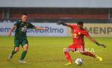 Gelandang Barito Putera, Syarahil berebut bola dengan bek Persebaya Riswan Lauhin pada pertandingan lanjutan BRI Liga 1 di Stadion Maguwoharjo, Sleman, Yogyakarta, Selasa (6/12/2022). Pada pertandingan ini Persebaya berhasil memetik poin penuh usai mengalahkan PS Barito Putera dengan skor 3-2. (FOTO : Republika/Wihdan Hidayat)