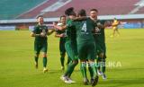 Pemain Persebaya melakukan selebrasi usai mencetak gol ke gawang Barito Putera pada pertandingan lanjutan BRI Liga 1 di Stadion Maguwoharjo, Sleman, Yogyakarta, Selasa (6/12/2022). Pada pertandingan ini Persebaya berhasil memetik poin penuh usai mengalahkan PS Barito Putera dengan skor 3-2. (FOTO : Republika/Wihdan Hidayat)