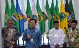 Pimpinan Komisi Pemberantasan Korupsi (KPK) Johanis Tanak, didampingi Anggota Ombudsman RI Indraza Marzuki Rais (kiri), Bupati Kabupaten Bandung Dadang Supriatna (kanan), dan Wakil Gubernur Jawa Barat Uu Ruzhanul Ulum (kedua kanan) menyampaikan keterangan pers usai Seminar Nasional Menciptakan Layanan Publik Bebas Korupsi saat Hari Antikorupsi Sedunia (Hakordia) yang digelar KPK, di Aula Barat, Gedung Sate, Kota Bandung (6/12/2022). Dalam upaya pencegahan korupsi, KPK terus mendorong terciptanya tata kelola pemerintahan dan perusahaan yang Clean and Good Governance. (FOTO : Edi Yusuf/Republika)