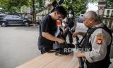 Polisi memeriksa tas warga yang mengunjungi Polres Metro Jakarta Selatan di Jakarta, Rabu (7/12/2022). Polres Metro Jakarta Selatan memperketat penjagaan di gerbang masuk pasca ledakan bom bunuh diri di Polsek Astanaanyar, Bandung, Jawa Barat. Republika/Putra M. Akbar (FOTO : Republika/Putra M. Akbar)