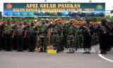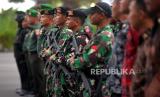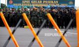 Aparat TNI mengikuti apel gelar pasukan dalam rangka pengamanan VVIP di Stadion Maguwoharjo, Sleman, Yogyakarta, Rabu (7/12/2022). Pasukan dari berbagai matra mengikuti apel gelar pasukan dalam rangka pernikahan putera Presiden Joko Widodo, Kaesang Pengarep dengan Erina Gudono pada Sabtu (10/12/2022) mendatang. (FOTO : Republika/Wihdan Hidayat)