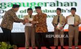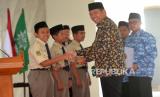 Direktur Madrasah Muallimin, Aly Aulia menyerahkan enugerah The Duke of Edinburgh kepada perwakilan santri saat resepsi Milad ke-104 Madrasah Muallimin Muhammadiyah Yogyakarta di Kampus Terpadu Madrasah Muallimin Muhammadiyah Yogyakarta, Sedayu, Bantul, Yogyakarta, Kamis (8/12/2022). Di Milad ke-104 ini Madrasah Muallimin mengusahakan standardisasi untuk menjangkau kualifikasi atau pengakuan internasional dan juga memperkuat sendi-sendi akademik supaya predikat baik dan unggul tidak terlepas dari Madrasah Mu’allimin Muhammadiyah Yogyakarta. Pada tahun ini di usia ke-104 tahun, bersama dengan Madrasah Mu’allimaat Muhammadiyah Yogyakarta, Mu’allimin sudah mendapat izin untuk membuka kelas internasional yang berbasis Cambridge. (FOTO : Republika/Wihdan Hidayat)