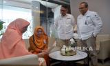 Pelaksana Tugas Direktur Utama PT Bank Muamalat Indonesia Tbk Hery Syafril (dua kanan) bersama Direktur PT Bank Muamalat Indonesia Tbk Wahyu Avianto (kanan) menyaksikan Karyawan memberikan penjelasan produk kepada nasabah prioritas usai peresmian pembukaan layanan Priority Center di kantor Cabang Buaran, Jakarta, Kamis, (8/12). Priority Center adalah ruangan khusus untuk nasabah prioritas yang memberikan berbagai kemudahan dan kenyamanan transaksi seperti jalur bebas antri, Private Dealing Room, Business Lounge dan Meeting Room. Segmen prioritas merupakan salah satu fokus bisnis perseroan. Saat ini kontribusi segmen prioritas adalah sebesar 25% dari total Dana Pihak Ketiga (DPK) Bank Muamalat. (FOTO : Republika/Prayogi)