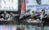 Ketua Komnas HAM Atnike Nova Sigiro (kedua kanan) bersama Komisioner Pendidikan & Penyulluhan Putu Elvina, Wakil Ketua Internal Pramono Ubaid Tanthowi, Wakil Ketua Eksternal Abdul Haris Semendawai, (dari kiri ke kanan) memberikan keterangan pers terkait refleksi penegakan dan pemajuan HAM di Indonesia tahun 2022 di Jakarta, Sabtu (10/12/2022). Sepanjang tahun 2022, Komnas HAM telah menerima 5.306 berkas pengaduan masyarakat terkait dugaan pelanggaran HAM. Dari berkas pengaduan tersebut tiga besar pihak teradu yang ditangani mekanisme pemantauan dan penyelidikan yaitu kepolisian, korporasi dan pemerintah pusat. Serta tiga hak yang banyak dilanggar dalam kasus-kasus tersebut adalah hak untuk memperoleh keadilan, hak atas kesejahteraan dan hak atas rasa aman. (FOTO : Republika/Putra M. Akbar)