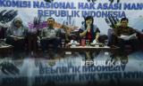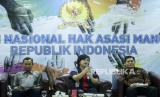 Ketua Komnas HAM Atnike Nova Sigiro (tengah) bersama Wakil Ketua Internal Pramono Ubaid Tanthowi (kiri) dan Wakil Ketua Eksternal Abdul Haris Semendawai (kanan) memberikan keterangan pers terkait refleksi penegakan dan pemajuan HAM di Indonesia tahun 2022 di Jakarta, Sabtu (10/12/2022). Sepanjang tahun 2022, Komnas HAM telah menerima 5.306 berkas pengaduan masyarakat terkait dugaan pelanggaran HAM. Dari berkas pengaduan tersebut tiga besar pihak teradu yang ditangani mekanisme pemantauan dan penyelidikan yaitu kepolisian, korporasi dan pemerintah pusat. Serta tiga hak yang banyak dilanggar dalam kasus-kasus tersebut adalah hak untuk memperoleh keadilan, hak atas kesejahteraan dan hak atas rasa aman. Republika/Putra M. Akbar (FOTO : Republika/Putra M. Akbar)