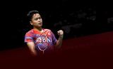 Anthony Ginting bereaksi setelah menang melawan Jonatan Christie pada pertandingan semifinal tunggal putra di HSBC BWF World Tour Finals 2022 di Bangkok, Thailand, 10 Desember 2022. HSBC BWF World Tour Finals 2022 berlangsung dari 07 hingga 11 Desember . (FOTO : EPA-EFE/DIEGO AZUBEL)