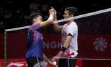 Anthony Ginting (Kiri) berjabat tangan dengan Jonatan Christie (Kanan) pada pertandingan semifinal Tunggal Putra di HSBC BWF World Tour Finals 2022 di Bangkok, Thailand, 10 Desember 2022. HSBC BWF World Tour Finals 2022 berjalan dari 07 hingga 11 Desember. (FOTO : EPA-EFE/DIEGO AZUBEL)