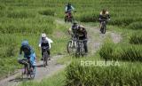 Peserta memacu sepedanya saat mengikuti kegiatan Republik Gobar (Gowes Bareng) Etape 2 di Buninagara, Kecamatan Kutawaringin, Kabupaten Bandung, Ahad (11/12/2022). Republika Perwakilan Jawa Barat menggelar kegiatan Republik Gobar Etape 2 yang diikuti oleh sedikitnya 200 pesepeda dari berbagai komunitas sepeda di Jawa Barat. (FOTO : ABDAN SYAKURA/REPUBLIKA)