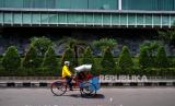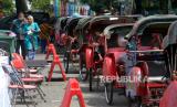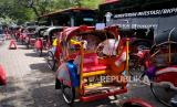 Puluhan becak kayuh menunggu mengantar tamu tasyakuran pernikahan putra Presiden Joko Widodo Kaesang dan Erina di Benteng Vestenberg, Surakarta, Jawa Tengah, Ahad (11/12/2022). Sebanyak 400 becak dan 35 andong warga Solo disiapkan untuk mengantarkan tamu tasyakuran ke Pura Mangkunegaran. Andong dan becak ini ditempatkan di dua titik kantong parkir yakni Stadion Manahan dan Benten Vastenberg. (FOTO : Republika/Wihdan Hidayat)