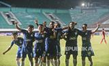 Pesepak bola PSIS Semarang Riyan Ardiansyah (ketiga kiri) melakukan selebrasi bersama rekannya usai mencetak gol ke gawang Persija Jakarta pada pertandingan Liga 1 di Stadion Maguwoharjo, Sleman, DI Yogyakarta, Selasa (13/12/2022). (FOTO : ANTARA FOTO/Hendra Nurdiyansyah)
