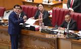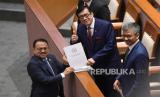 REPUBLIKA.CO.ID, JAKARTA -- Menteri Hukum dan HAM Yasonna Laoly (kanan) menerima berkas pandangan mini fraksi terkait pembahasan Rancangan Undang-Undang (RUU) tentang Pengesahan Perjanjian antara Pemerintah Republik Indonesia dan Pemerintah Republik Singapura tentang Ekstradisi Buronan dari Wakil Ketua Komisi III Pangeran Khairul Saleh (kiri) saat rapat paripurna di Kompleks Parlemen, Senayan, Jakarta, Kamis (15/12/2022).