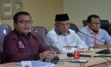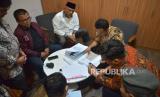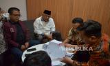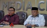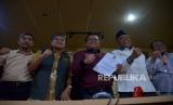 REPUBLIKA.CO.ID, JAKARTA -- Ketua Tim Advokasi Hukum Partai Ummat Denny Indrayana (kanan) memberikan keterangan pers terkait pemohonan penyelesaian sengketa proses pemilu di Kantor Bawaslu, Jakarta, Jumat (16/12/2022).
