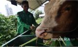 Iyon warga sekitar pabrik memberi makan sapi di fasilitas Edupark Semen Gresik Rembang, Jumat (16/12/2022). Fasilitas Edupark seluas 1,6 ha yang bisa dimanfaatkan para petani untuk belajar. Edupark ini berkonsep pertanian dan peternakan terpadu. (FOTO : Republika/Yogi Ardhi)