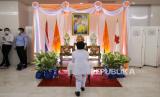 Seorang pria berlutut di depan potret Putri Thailand Bajrakitiyabha yang mengharapkan kesembuhannya, di dalam Rumah Sakit Memorial Chulalongkorn di Bangkok, Thailand, 16 Desember 2022. Putri Thailand Bajrakitiyabha dirawat di Rumah Sakit Memorial King Chulalongkorn setelah ia jatuh pingsan pada malam tanggal 14 Desember 2022 karena gejala terkait jantung, Biro Rumah Tangga Kerajaan mengumumkan pada 15 Desember 2022. Dokter di rumah sakit akan melakukan pemeriksaan dan memberikan perawatan medis, tambah Biro Rumah Tangga Kerajaan. (FOTO : EPA-EFE/DIEGO AZUBEL)