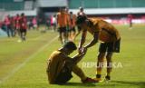 Bek kiri Bhayangkara FC, Abdul Rahman mengihur Sani Rizky usai kalah dari Rans Nusantara FC pada lanjutan pertandingan BRI Liga 1 di Stadion Maguwoharjo, Sleman, Yogyakarta, Jumat (16/12/2022). Pada pertandingan ini Rans Nusantara berhasil memetik poin penuh usai mengalahkan Bhayangkara FC dengan skor 2-1. (FOTO : Republika/Wihdan Hidayat)