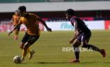 Bek kiri Rans Nusantara FC, Saddam membayangi gelandang serang Bhayangkara FC Antoni pada lanjutan pertandingan BRI Liga 1 di Stadion Maguwoharjo, Sleman, Yogyakarta, Jumat (16/12/2022). Pada pertandingan ini Rans Nusantara berhasil memetik poin penuh usai mengalahkan Bhayangkara FC dengan skor 2-1. (FOTO : Republika/Wihdan Hidayat)
