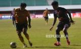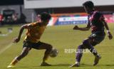 Bek kiri Bhayangkara FC, Abdul Rahman mencoba melewati bek Rans Nusantara FC Alfin Tuasalamony pada lanjutan pertandingan BRI Liga 1 di Stadion Maguwoharjo, Sleman, Yogyakarta, Jumat (16/12/2022). Pada pertandingan ini Rans Nusantara berhasil memetik poin penuh usai mengalahkan Bhayangkara FC dengan skor 2-1. (FOTO : Republika/Wihdan Hidayat)