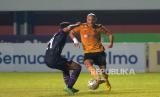 Penyerang Bhayangkara FC, Ezzejarri mencoba melewati bek Rans Nusantara FC Hamdan Zamzani pada lanjutan pertandingan BRI Liga 1 di Stadion Maguwoharjo, Sleman, Yogyakarta, Jumat (16/12/2022). Pada pertandingan ini Rans Nusantara berhasil memetik poin penuh usai mengalahkan Bhayangkara FC dengan skor 2-1. (FOTO : Republika/Wihdan Hidayat)