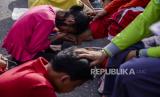 Anak-anak mencium kaki ibunya saat aksi cuci kaki ibu di Jalan Suryapranoto, Gambir, Jakarta, Ahad (18/12/2022). Kegiatan yang diikuti oleh ratusan peserta dalam rangka jelang Hari Ibu tersebut bertajuk Perempuan Berdaya Indonesia Maju. (FOTO : Republika/Putra M. Akbar)