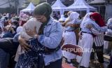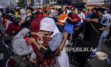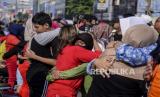 Anak-anak memeluk ibunya saat aksi cuci kaki ibu di Jalan Suryapranoto, Gambir, Jakarta, Ahad (18/12/2022). Kegiatan yang diikuti oleh ratusan peserta dalam rangka jelang Hari Ibu tersebut bertajuk Perempuan Berdaya Indonesia Maju. Republika/Putra M. Akbar (FOTO : Republika/Putra M. Akbar)