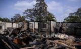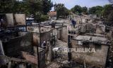Suasana pemukiman semi permanen yang hangus terbakar di kawasan Manggarai, Jakarta, Ahad (18/12/2022). Kebakaran yang terjadi pada Sabtu (17/12/2022) tersebut menghanguskan 52 rumah semi permanen yang diduga akibat sambaran petir. Republika/Putra M. Akbar (FOTO : Republika/Putra M. Akbar)