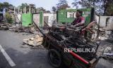 Pemulung membawa puing-puing sisa kebakaran di kawasan Manggarai, Jakarta, Ahad (18/12/2022). Kebakaran yang terjadi pada Sabtu (17/12/2022) tersebut menghanguskan 52 rumah semi permanen yang diduga akibat sambaran petir. Republika/Putra M. Akbar (FOTO : Republika/Putra M. Akbar)