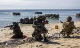 Sejumlah prajurit TNI AL dan Angkatan Darat Australia (RAA)  melakukan pendaratan saat latihan bersama (Latma) AL Indonesia dengan AL Australia di Pusat Latihan Tempur (Puslatpur) Marinir di Pantai Todak, Dabo Singkep, Kepulauan Riau, Ahad (20/11/2022). Latihan bersama tersebu sebagai rangkaian kegiatan Program Indo-Pacific Endeavour (IPE) yang diselenggarakan oleh Angkatan Laut Australia (HMAS) untuk melatih kerja sama taktik pertempuran, juga untuk meningkatkan hubungan bilateral kedua negara. ANTARA FOTO/Teguh Prihatna/foc. (FOTO : ANTARA/Teguh Prihatna)