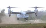 Pesawat Bell Boeing V-22 Osprey tilt rotor lepas landas saat Latihan Cooperation Afload Readiness and Training (CARAT) antara Korps Marinir TNI AL dengan Korps Marinir Amerika Serikat di Pusat Latihan Tempur (Puslatpur) Marinir 5 Baluran, Situbondo, Jawa Timur, Minggu (18/12/2022). Latihan bersama pasukan elit Indonesia dan Amerika Serikat yang digelar selama 10 hari itu selain untuk berbagi teknik dan taktik pertempuran juga meningkatkan hubungan militer kedua negara.  (FOTO : ANTARA FOTO/Budi Candra Setya)