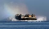 Kendaraan amfibi pengangkut  material tempur Landing Craft Air Cushion (LCAC) milik United State Marines Corps (USMC) melintasi laut untuk menuju daratan di Pantai Banongan, Pusat Latihan Tempur (Puslatpur) Marinir 5, Situbondo, Jawa Timur, Senin (19/12/2022). Kendaraan yang mampu berjalan di atas lumpur, air, dan daratan dengan membawa beban yang cukup berat tersebut digunakan USMC sebagai unsur pendarat amfibi pada Latihan Bersama (latma) Coperation Afload Readiness And Training (CARAT) 2022.  (FOTO : ANTARA FOTO/Budi Candra Setya)