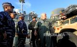 Komandan Pasmar 2 Brigjen TNI (Mar) Suherlan (ketiga kiri) bersama Komandan Gugus Tempur Laut (Danguspurla) Koamarda II Laksma TNI Deny Prasetyo (kedua kiri) didampingi Komandan Batalyon 2 United State Marines Corps (USMC) Lieutenant Colonel Jared Reddinger (kedua kanan) meninjau kendaraan amfibi pengangkut material tempur Landing Craft Air Cushion (LCAC) milik USMC di Pantai Banongan, Pusat Latihan Tempur (Puslatpur) Marinir 5, Situbondo, Jawa Timur, Senin (19/12/2022). Kendaraan yang mampu berjalan di atas lumpur, air, dan daratan dengan membawa beban yang cukup berat tersebut digunakan USMC sebagai unsur pendarat amfibi pada Latihan Bersama (latma) Coperation Afload Readiness And Training (CARAT) 2022.  (FOTO : ANTARA FOTO/Budi Candra Setya)