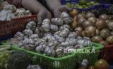 Pedagang menunjukkan bawang putih di kiosnya di Pasar Kosambi, Kota Bandung, Rabu (21/12/2022). Pedagang di pasar tersebut menyatakan, jelang perayaan Natal dan Tahun Baru 2023 sejumlah bahan pokok mengalami kenaikan diantaranya harga daging ayam dari Rp30 ribu menjadi Rp35 ribu per kilogram, telur ayam menjadi Rp22 ribu, cabai rawit menjadi Rp50 ribu, bawang merah menjadi Rp35 ribu dan beras dari Rp9 ribu menjadi Rp10 ribu. Republika/Abdan Syakura (FOTO : ABDAN SYAKURA/REPUBLIKA)