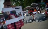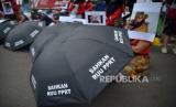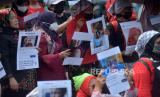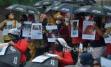 Sejumlah ibu Pekerja Rumah Tangga (PRT) yang tergabung dalam koalisi sipil untuk Undang-Undang (UU) Perlindungan Pekerja Rumah Tangga (PPRT) melakukan aksi di seberang Istana Merdeka, Jakarta, Rabu (21/12/2022). Aksi segaligus memperingati hari ibu 2022 tersebut mendesak Presiden dan Ketua DPR untuk mendukung pengesahan UU PPRT demi menghentikan kekerasan dan praktek perbudakan modern terhadap ibu-ibu pekerja rumah tangga. (FOTO : Republika/Prayogi)