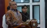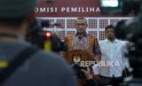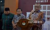Ketua KPU Hasyim Asyari memberikan keterangan pers menyikapi keputusan Mahkamah Konstitusi atas Judicial Review Undang-undang Nomor 7 Tahun 2017 terkait Kewenangan Penyusunan Daerah Pemilihan pada Pemilu 2024 di Kantor KPU, Jakarta, Rabu (21/12/2022). Pasca putusan judicial review UU Nomor 7 Tahun 2017, KPU meminta bantuan kepada sejumlah akademisi pakar kepemiluan dalam menata dan menyusun daerah pemilihan (Dapil) DPR RI dan DPRD provinsi untuk Pemilu 2024. (FOTO : Republika/Prayogi)