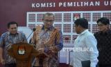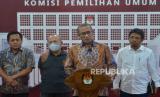 Ketua KPU Hasyim Asyari (tengah) memberikan keterangan pers menyikapi keputusan Mahkamah Konstitusi atas Judicial Review Undang-undang Nomor 7 Tahun 2017 terkait Kewenangan Penyusunan Daerah Pemilihan pada Pemilu 2024 di Kantor KPU, Jakarta, Rabu (21/12/2022). Pasca putusan judicial review UU Nomor 7 Tahun 2017, KPU meminta bantuan kepada sejumlah akademisi pakar kepemiluan dalam menata dan menyusun daerah pemilihan (Dapil) DPR RI dan DPRD provinsi untuk Pemilu 2024. Republika/Prayogi (FOTO : Republika/Prayogi)
