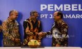 Direktur Jenderal Pembiayaan Infrastructure PUPR Herry Trisaputra Zuna, Direktur Utama PT Margautama Nusantara Danni Hasan, Direktur Utama PT Jasa Marga (Persero) Tbk Subakti Syukur (dari kiri ke kanan) bersalaman saat penyerahan akta jual beli saham di Jakarta, Rabu (21/12/2022). PT Margautama Nusantara melalui anak usaha PT Nusantara Infrastructure resmi menjadi pemegang 40 persen kepemilikan saham PT Jasamarga Jalanlayang Cikampek yang mengelola Jalan Layang Mohamed Bin Zayed. Republika/Putra M. Akbar (FOTO : Republika/Putra M. Akbar)
