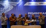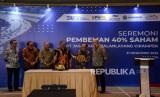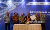 REPUBLIKA.CO.ID,JAKARTA -- Direktur Utama PT Nusantara Infrastructure Tbk Ramdani Basri bersama Anggota Dewan Pertimbangan Presiden Sidarto Danusubroto, Direktur Jenderal Pembiayaan Infrastructure PUPR Herry Trisaputra Zuna, Direktur Utama PT Margautama Nusantara Danni Hasan, Direktur Utama PT Jasa Marga (Persero) Tbk Subakti Syukur dan Kepala BPJT Danang Parikesit (dari kiri ke kanan) saat penyerahan akta jual beli saham di Jakarta, Rabu (21/12/2022).