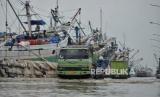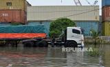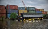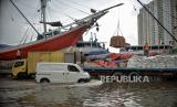 Kendaraan melintas saat banjir rob di Pelabuhan Sunda Kelapa, Jakarta Utara, Senin (26/12/2022). Badan Penanggulangan Bencana Daerah (BPBD) DKI Jakarta mengimbau masyarakat di pesisir Jakarta Utara untuk mewaspadai terhadap potensi banjir pesisir atau rob yang terjadi di beberapa titik, salah satunya Pelabuhan Sunda Kelapa. Pada Senin (26/12) sekitar pukul 12.30 WIB, tingga muka air akibat rob mencapai sekitar 30-40 cm, sementara sejumlah pekerja tetap melakukan aktivitas hariannya di tengah kondisi rob. Republika/Thoudy Badai (FOTO : Republika/Thoudy Badai)