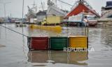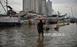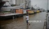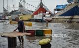 Suasana banjir rob di Pelabuhan Sunda Kelapa, Jakarta Utara, Senin (26/12/2022). Badan Penanggulangan Bencana Daerah (BPBD) DKI Jakarta mengimbau masyarakat di pesisir Jakarta Utara untuk mewaspadai terhadap potensi banjir pesisir atau rob yang terjadi di beberapa titik, salah satunya Pelabuhan Sunda Kelapa. Pada Senin (26/12) sekitar pukul 12.30 WIB, tingga muka air akibat rob mencapai sekitar 30-40 cm, sementara sejumlah pekerja tetap melakukan aktivitas hariannya di tengah kondisi rob. Republika/Thoudy Badai (FOTO : Republika/Thoudy Badai)
