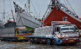 Pekerja beraktivitas saat banjir rob di Pelabuhan Sunda Kelapa, Jakarta Utara, Senin (26/12/2022). Badan Penanggulangan Bencana Daerah (BPBD) DKI Jakarta mengimbau masyarakat di pesisir Jakarta Utara untuk mewaspadai terhadap potensi banjir pesisir atau rob yang terjadi di beberapa titik, salah satunya Pelabuhan Sunda Kelapa. Pada Senin (26/12) sekitar pukul 12.30 WIB, tingga muka air akibat rob mencapai sekitar 30-40 cm, sementara sejumlah pekerja tetap melakukan aktivitas hariannya di tengah kondisi rob. Republika/Thoudy Badai (FOTO : Republika/Thoudy Badai)