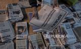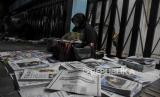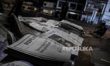 Agen koran menata koran di salah satu lapak di Kawasan Cikapundung, Jalan Dr Ir Sukarno, Sumur Bandung, Kota Bandung, Kamis (29/12/2022). Berdasarkan keterangan agen koran di salah satu pusat distribusi koran dan majalah yang telah ada sejak 1970 tersebut, omzet penjualan koran menurun hingga 10 kali lipat atau hanya 180 eksemplar per hari dibandingkan dengan beberapa dekade terakhir yang mampu menjual 1.800 eksemplar per hari. Hal tersebut dikarenakan konvergensi media cetak ke daring dan akses informasi yang mudah melalui internet serta biaya produksi koran yang mahal. Republika/Abdan Syakura (FOTO : ABDAN SYAKURA/REPUBLIKA)