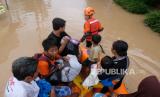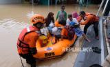 REPUBLIKA.CO.ID, KENDAL -- Relawan bersama anggota tim SAR mengevakuasi warga menggunakan perahu karet di lokasi bencana banjir Desa Kebonadem, Brangsong, Kendal, Jawa Tengah, Sabtu (31/12/2022). Hujan lebat sejak Jumat (30/12/2022) sore hingga Sabtu (31/12/2022) menyebabkan bencana banjir di sembilan kecamatan di kabupaten Kendal dengan kedalaman 50 cm hingga 1,5 meter.