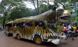 Pengunjung menaiki mobil wisata di Taman Margasatwa Ragunan, Jakarta, Ahad (1/1/2023). Taman Margasatwa Ragunan tersebut masih menjadi tujuan wisata yang diminati warga Jakarta dan sekitarnya pada Libur awal tahun baru 2023. Walau sejak pagi dilanda hujan yang cukup awet tidak menyurutkan warga untuk tetap berlibur. (FOTO : Republika/Prayogi.)