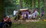 Pengunjung berteduh ketika mengunjungi Taman Margasatwa Ragunan di Jakarta, Ahad (1/1/2023). Taman Margasatwa Ragunan tersebut masih menjadi tujuan wisata yang diminati warga Jakarta dan sekitarnya pada Libur awal tahun baru 2023. Walau sejak pagi dilanda hujan yang cukup awet tidak menyurutkan warga untuk tetap berlibur. (FOTO : Republika/Prayogi)