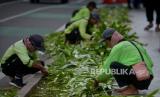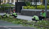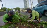 Petugas Dinas Pertamanan memotong tamanam yang berada di kawasan Bundaran HI, Jakarta, Ahad (1/1/2023). Sejumlah tanaman di sudut-sudut area Bundaran HI tersebut tak lagi berdiri tegak/rusak akibat terinjak-injak oleh masyarakat yang berkumpul merayakan malam Tahun Baru 2023. (FOTO : Republika/Prayogi.)
