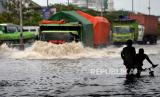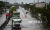 Kendaraan menerobos banjir di Kawasan Kaligawe, Semarang, Jawa Tengah, Senin (2/1/2023). Tingginya curah hujan di Semarang menyebabkan ruas jalan raya Semarang-Demak terganggu. Saat ini hanya bisa dilewati oleh kendaraan besar. (FOTO : Republika/Wihdan Hidayat)