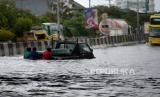 Kendaraan macet saat menerobos banjir di Kawasan Kaligawe, Semarang, Jawa Tengah, Senin (2/1/2023). Tingginya curah hujan di Semarang menyebabkan ruas jalan raya Semarang-Demak terganggu. Saat ini hanya bisa dilewati oleh kendaraan besar. (FOTO : Republika/Wihdan Hidayat)