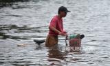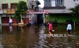 Warga menerobos banjir di Kawasan Kaligawe, Semarang, Jawa Tengah, Senin (2/1/2023). Tingginya curah hujan di Semarang menyebabkan ruas jalan raya Semarang-Demak terganggu. Saat ini hanya bisa dilewati oleh kendaraan besar. (FOTO : Republika/Wihdan Hidayat)